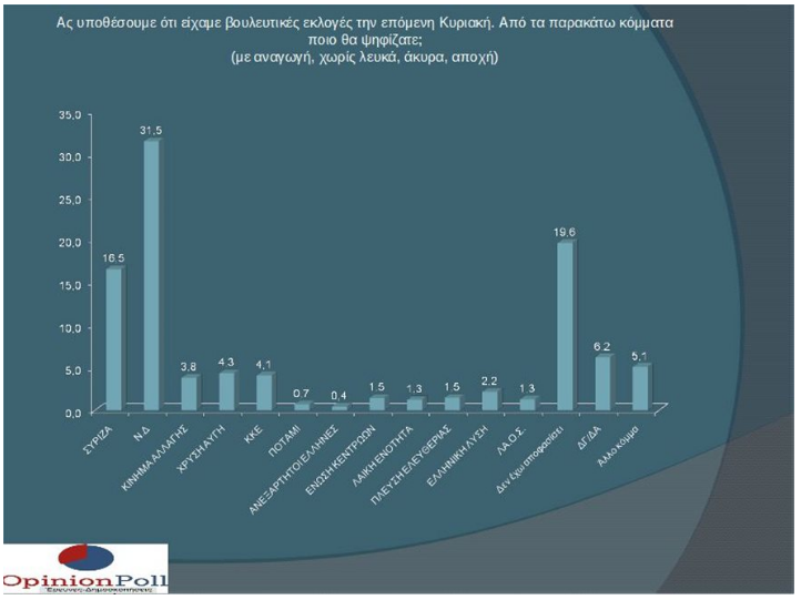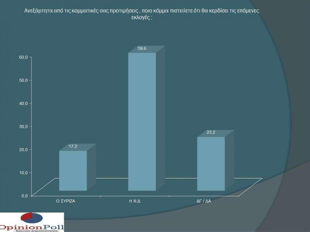 «Τα αποτελέσματά της δείχνουν άνοιγμα της ψαλίδας υπέρ της Ν.Δ κατά 1% σε σχέση με τα αποτελέσματα της αντίστοιχης έρευνας το Σεπτέμβριο. Η διαφορά στην πρόθεση ψήφου με αναγωγή χωρίς λευκά , άκυρα , αποχή ανάμεσα στην Ν.Δ και τον ΣΥΡΙΖΑ βρίσκεται στο 15%. Η Ν.Δ αυξάνει τις δυνάμεις της κατά 1.6% και ο ΣΥΡΙΖΑ κατά 0.5%. Ο Κυριάκος Μητσοτάκης προηγείται στην καταλληλότητα για Πρωθυπουργός 11%, ενώ η παράσταση νίκης εμφανίζεται καταλυτική με 59.6% να εμφανίζεται να θεωρεί ότι θα νικήσει η Ν.Δ , έναντι ενός 17.2% που θεωρεί ότι τελικά θα νικήσει ο ΣΥΡΙΖΑ» τονίζει χαρακτηριστικά.