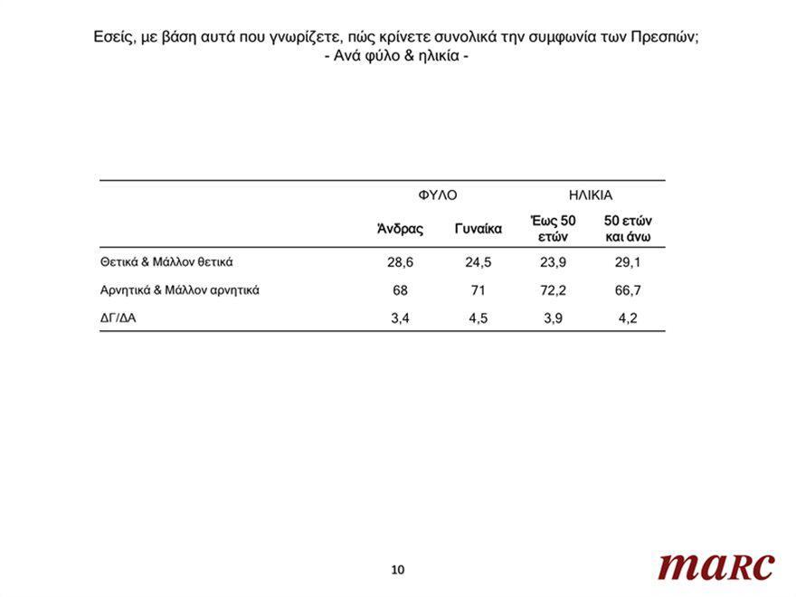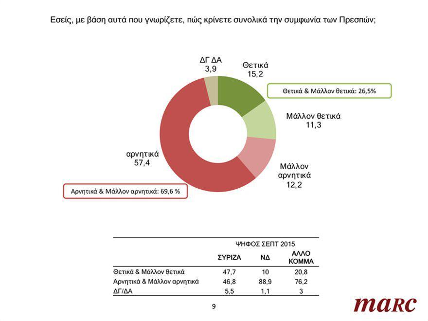 Το μεγαλύτερο ποσοστό των Ελλήνων σε ποσοστό 69,6% κρίνουν αρνητικά και μάλλον αρνητικά τη Συμφωνία των Πρεσπών. Πολύ σημαντικό είναι το εύρημα του γκάλοπ που δείχνει ότι η απόλυτη πλειοψηφία των πολιτών σε ποσοστό 57,4% πιστεύουν ξεκάθαρα ότι η Συμφωνία των Πρεσπών για τη Βόρεια Μακεδονία είναι αρνητική για τα ελληνικά συμφέροντα. Εις ό,τι αφορά την ηλικιακή κατανομή, βαρύνουσας σημασίας θεωρείται και το γεγονός ότι οι Έλληνες μέχρι 50 ετών τοποθετούνται πιο αρνητικά απέναντι στη Συμφωνία των Πρεσπών σε σχέση με τις ηλικιακές ομάδες των πολιτών άνω των 50 ετών.