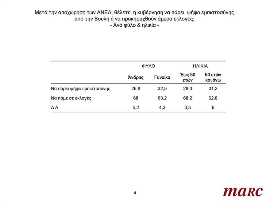 Στο ερώτημα «μετά την αποχώρηση των ΑΝΕΛ, θέλετε η κυβέρνηση να πάρει ψήφο εμπιστοσύνης από τη Βουλή ή να προκηρυχθούν άμεσα εκλογές» ποσοστό 65,5% επί των συμμετεχόντων απαντούν «να πάμε σε εκλογές». Ποσοστό 29,7% ή περίπου τρεις στους 10 απαντούν ότι προτιμούν η κυβέρνηση να πάρει ψήφο εμπιστοσύνης και ένα ποσοστό 4,8% επιλέγει να πει «δεν απαντώ».
