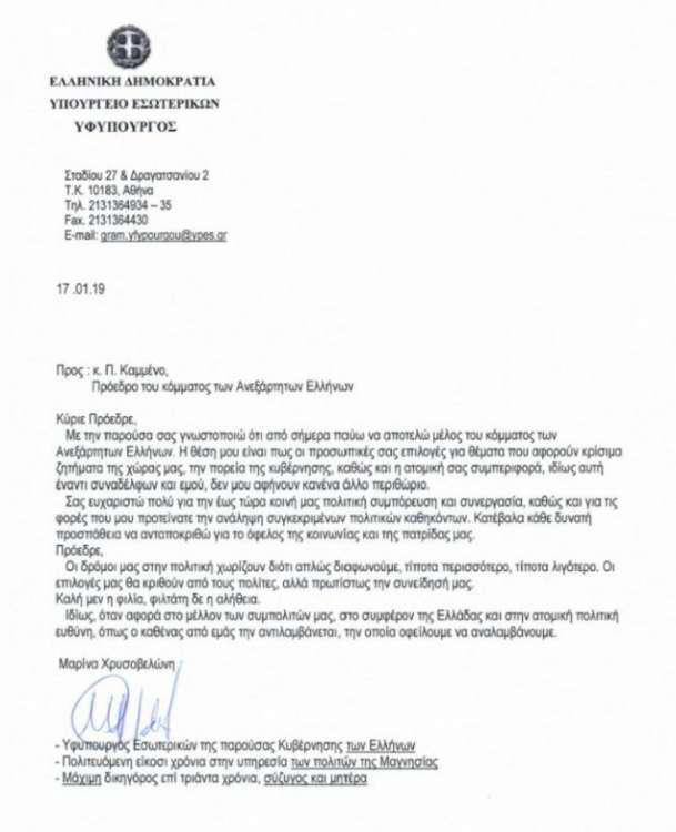 H υφυπουργός Εσωτερικών σε επιστολή της προς τον Πάνο Καμμένο του γνωστοποιεί ότι παραιτείται από τους ΑΝΕΛ με αιχμές για την συμπεριφορά του προέδρου του κόμματος.