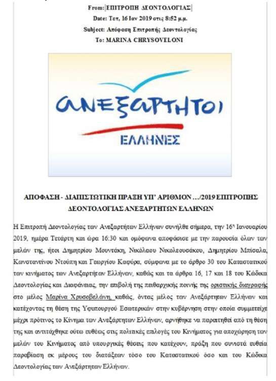 Η κυρία Χρυσοβελώνη το απόγευμα της Παρασκευής έστειλε επιστολή προς τον Πάνο Καμμένο και του γνωστοποιεί ότι παραιτείται από μέλος των ΑΝΕΛ με αιχμές για την συμπεριφορά του προέδρου του κόμματος.