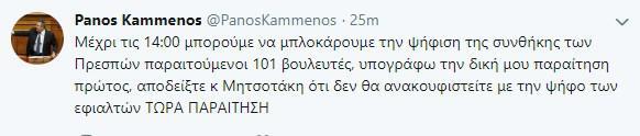 «Μέχρι τις 14:00 μπορούμε να μπλοκάρουμε την ψήφιση της συνθήκης των Πρεσπών παραιτούμενοι 101 βουλευτές, υπογράφω την δική μου παραίτηση πρώτος, αποδείξτε κ. Μητσοτάκη ότι δεν θα ανακουφιστείτε με την ψήφο των εφιαλτών. ΤΩΡΑ ΠΑΡΑΙΤΗΣΗ», γράφει σε ανάρτηση του στο twitter ο Πρόεδρος των ΑΝΕΛ, Πάνος Καμμένος.