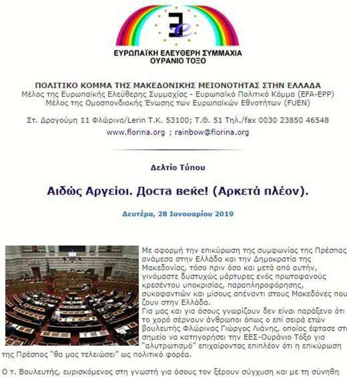 Για μας και για όσους γνωρίζουν δεν είναι παράξενο ότι το χορό σέρνουν άνθρωποι όπως ο επί σειρά ετών βουλευτής Φλώρινας Γιώργος Λιάνης, οποίος έφτασε στο σημείο να κατηγορήσει την ΕΕΣ-Ουράνιο Τόξο για “αλυτρωτισμό” επιχαίροντας επιπλέον ότι η επικύρωση της Πρέσπας “θα μας τελειώσει” ως πολιτικό φορέα.