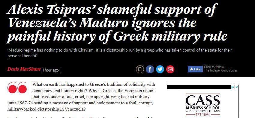 «Τι στο καλό συμβαίνει με την προσήλωση της Ελλάδας στη δημοκρατία και τα ανθρώπινα δικαιώματα; Γιατί η Ελλάδα, μια ευρωπαϊκή χώρα που έζησε υπό μια αχρεία, σκληρή, διεφθαρμένη δεξιά χούντα το 1967-1974, στέλνει μηνύματα στήριξης και σε μια άσχημη, διεφθαρμένη δικτατορία στη Βενεζουέλα;», τονίζει στον πρόλογο του άρθρου του στην εφημερίδα Independent.