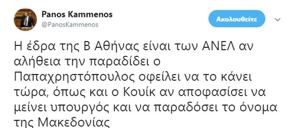 «Η έδρα της Β Αθήνας είναι των ΑΝΕΛ αν αλήθεια την παραδίδει ο Παπαχρηστόπουλος οφείλει να το κάνει τώρα, όπως και ο Κουίκ αν αποφασίσει να μείνει υπουργός και να παραδόσει το όνομα της Μακεδονίας» έγραψε συγκεκριμένα ο Πάνος Καμμένος.