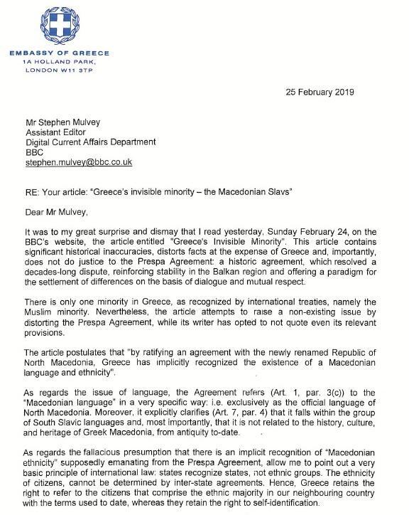 Ειδικότερα, στην επιστολή του o έλληνας πρέσβης Δημήτρης Καραμήτσος – Τζιράς εκφράζει στο βρετανικό δίκτυο την έκπληξη και απογοήτευση της ελληνικής κυβέρνησης για το δημοσίευμα, κάνοντας λόγο για ιστορικές ανακρίβειες, και επισημαίνοντας ότι δεν υφίσταται «μακεδονική μειονότητα» στην Ελλάδα.
