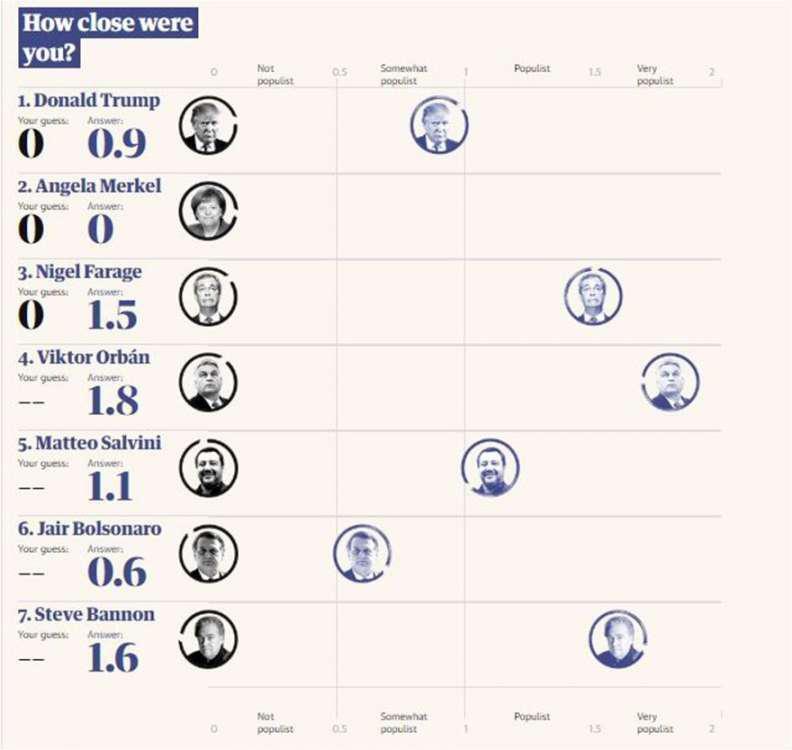 Από την άλλη ο πρώην επικεφαλής του ευρωσκεπτικιστικού κόμματος της Βρετανίας, Ukip, Νάιτζελ Φάρατζ είχε επίσης εκτοξεύσει λαϊκιστικές κορώνες τη νύχτα του δημοψηφίσματος για το Brexit το 2016, όταν έκανε λόγο για «νίκη για τον πραγματικό λαό, τον κανονικό λαό, τον αξιοπρεπή λαό». Αντιθέτως, το σκορ του νεοεκλεγέντος -και ακροδεξιού- προέδρου της Βραζιλίας ήταν μόλις αρκετές για να τον βάλουν στην κατηγορία των λαϊκιστών.