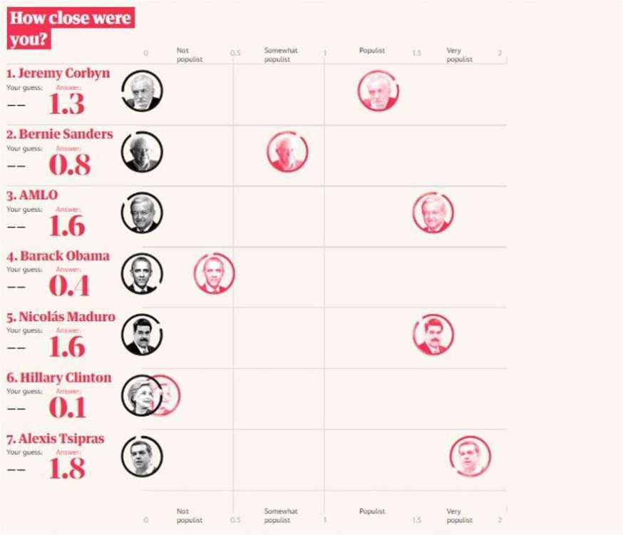 Στη συνέχεια η Team Populism, ένα δίκτυο πολιτικών επιστημόνων, ανέλυσε τα κείμενα τουλάχιστον δύο προεκλογικών ομιλιών των εν λόγω πολιτικών, δίνοντας βάση στην έκταση της ρητορικής του λαϊκισμού που περιέχονταν σε αυτές.