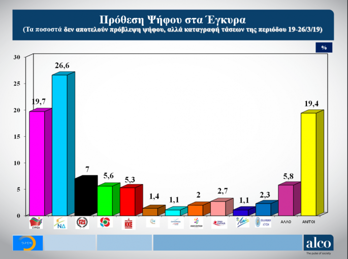 Στην πρόθεση ψήφου στα έγκυρα η Νέα Δημοκρατία συγκεντρώνει το 26,6% έναντι του 19,7% του και ΣΥΡΙΖΑ, ενώ στην τρίτη θέση βρίσκεται η Χρυσή Αυγή με 7%. Ακολουθεί το Κίνημα Αλλαγής με 5,6% και το ΚΚΕ με 5,3%. Εκτός Βουλής μένουν οι ΑΝΕΛ, η Ένωση Κεντρώων και το Ποτάμι.