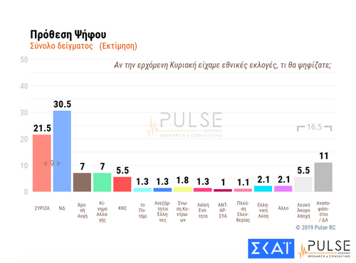 Η μέτρηση δείχνει πεντακομματική Βουλή, ενώ οι πολίτες απαντούν ότι κριτήρια για την ψήφο τους θα είναι η οικονομία (ανάπτυξη και φόροι) και η Συμφωνία των Πρεσπών. Ιδίως στη Β. Ελλάδα (Μακεδονία-Θράκη) το κριτήριο για το μακεδονικό είναι το πρώτο.