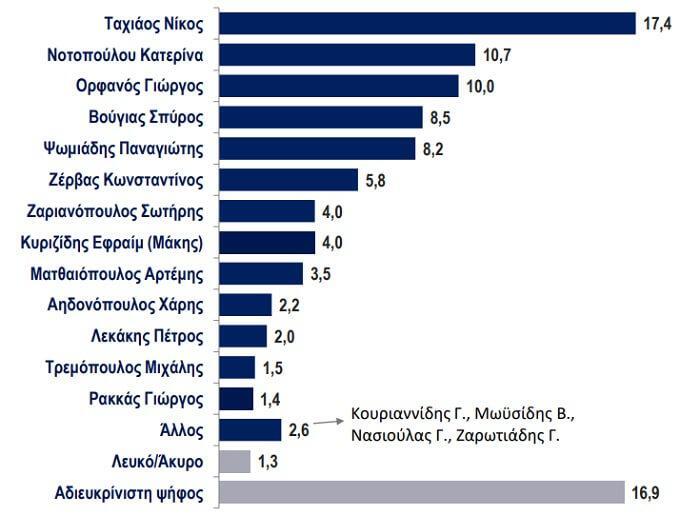 Στην ερώτηση ποιον είναι πιο πιθανό να ψηφίζατε εάν την επόμενη Κυριακή είχαμε εκλογές, ο Νίκος Ταχιάος αναδεικνύεται πρώτος με ποσοστό 17,4% και ακολουθεί η Κατερίνα Νοτοπούλου με 10,7%. Τρίτος με μικρή διαφορά και ποσοστό 10% έρχεται ο ανεξάρτητος υποψήφιος Γιώργος Ορφανός, ενώ την πεντάδα ολοκληρώνουν ο Σπύρος Βούγιας με ποσοστό 8,5% και ο Παναγιώτης Ψωμιάδης με 8,2%.