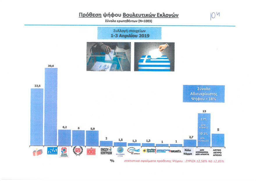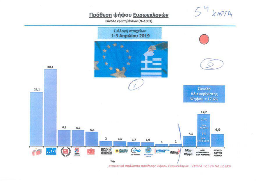 Στην πρόθεση ψήφου για τις ευρωεκλογές, το προβάδισμα της Νέας Δημοκρατίας διευρύνεται στις 9 ποσοστιαίες μονάδες. Ειδικότερα, η ΝΔ συγκεντρώνει 30,1% και ο ΣΥΡΙΖΑ 21,1% Ακολουθούν η Χρυσή Αυγή και το Κίνημα Αλλαγής με 6,2% αντίστοιχα, το ΚΚΕ με 5,5%, η Ένωση Κεντρώων με 2%, οι Οικολόγοι Πράσινοι με 1,9%, το Ποτάμι με 1,7%, η Ελληνική Λύση με 1,6%, οι ΑΝΕΛ με 1% και το ΜέΡΑ 25 με 1%. Στο 17,6% ανέρχεται η αδιευκρίνιστη ψήφος, ενώ άλλο κόμμα επιλέγει το 4,1%.