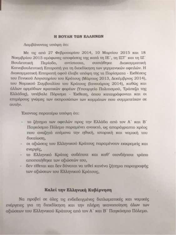 Η Βουλή καλεί την Ελληνική Κυβέρνηση να προβεί σε όλες τις ενδεδειγμένες διπλωματικές και νομικές ενέργειες για τη διεκδίκηση και την πλήρη ικανοποίηση όλων των αξιώσεων του Ελληνικού Κράτους από τον Α και Β Παγκόσμιο Πόλεμο».