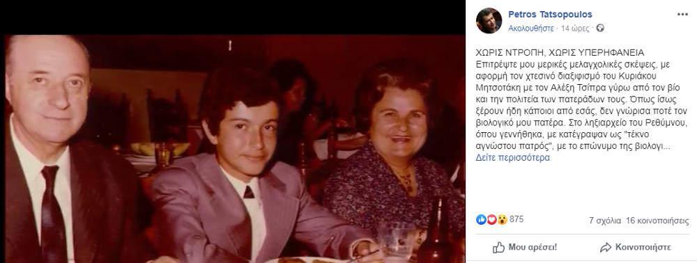 Επιτρέψτε μου μερικές μελαγχολικές σκέψεις, με αφορμή τον χτεσινό διαξιφισμό του Κυριάκου Μητσοτάκη με τον Αλέξη Τσίπρα γύρω από τον βίο και την πολιτεία των πατεράδων τους. Όπως ίσως ξέρουν ήδη κάποιοι από εσάς, δεν γνώρισα ποτέ τον βιολογικό μου πατέρα. Στο ληξιαρχείο του Ρεθύμνου, όπου γεννήθηκα, με κατέγραψαν ως “τέκνο αγνώστου πατρός”, με το επώνυμο της βιολογικής μου μητέρας και μονάχα πολύ αργότερα, μετά την υιοθεσία μου, πήρα το επώνυμο του θετού μου πατέρα. Ως τέκνο αγνώστου πατρός λοιπόν, δεν έχω κανένα στοιχείο για εκείνον: δεν γνωρίζω αν ζει ακόμη ή αν έχει πεθάνει, πόσω μάλλον αν θα πρέπει να ντρέπομαι γι’ αυτόν ή αν θα πρέπει να υπερηφανεύομαι», έγραψε στην αρχή της ανάρτησής του ο Πέτρος Τατσόπουλος.