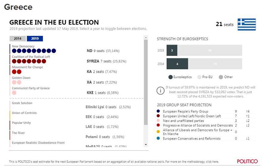 Σύμφωνα με την πρόβλεψη του ιστότοπου, η ΝΔ καταλαμβάνει εννέα έδρες στο νέο Ευρωκοινοβούλιο και ο ΣΥΡΙΖΑ 7. ΚΙΝΑΛ και Χρυσή Αυγή λαμβάνουν 2 έδρες, ενώ το ΚΚΕ μία έδρα.