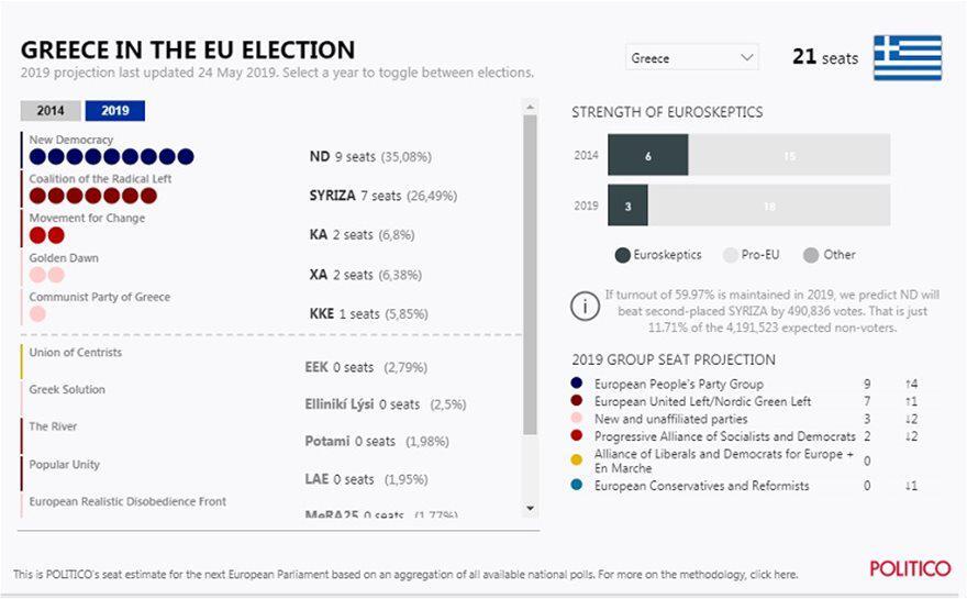 Με βάση την πρόβλεψη του Politico, η Νέα Δημοκρατία θα καταλάβει εννιά έδρες στην Ευρωβουλή, έναντι επτά του ΣΥΡΙΖΑ και δύο του ΚΙΝΑΛ και της Χρυσής Αυγής. Το ΚΚΕ φαίνεται να καταλαμβάνει μία έδρα.