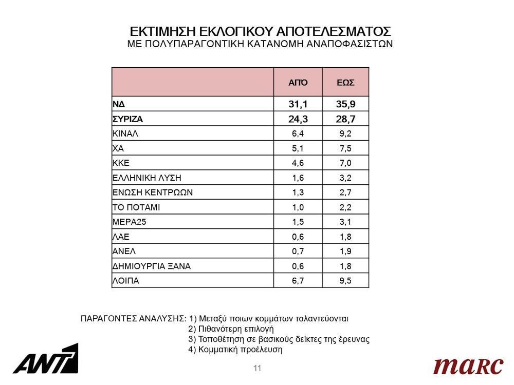 35,5% [35%] η ΝΔ και 27,1% [25,9%] ο ΣΥΡΙΖΑ (-8,4 [-9,1]μονάδες, με εύρος απόκλισης +/-2,3 έως 2,4%), με αναλογική κατανομή των αναποφάσιστων 33,6% [33,1%] η ΝΔ και 29,1% [27,7%] ο ΣΥΡΙΖΑ (-4,5 [-5,4] μονάδες με εύρος απόκλισης +/-2,3 έως 2,4%), με κατανομή των αναποφάσιστων στο κόμμα προέλευσης τους.