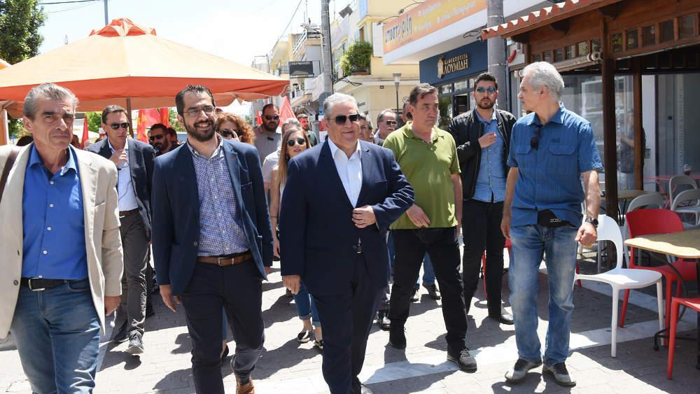 Τον υποδέχθηκαν μέλη και φίλοι του ΚΚΕ, ο υποψήφιος δήμαρχος Περιστερίου με την «Λαϊκή Συσπείρωση», Γιώργος Σιδέρης, οι υποψήφιοι ευρωβουλευτές, Κώστας Παπαδάκης, Χριστίνα Παναγιωτακοπούλου, Λευτέρης Νικολάου-Αλαβάνος και η βουλευτής Λιάνα Κανέλλη.