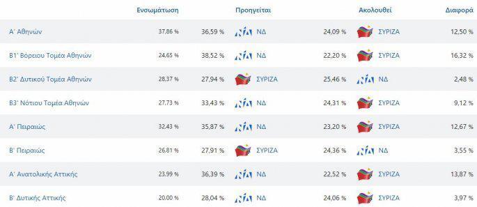 Στην Α’ εκλογική περιφέρειας της Ανατολικής Αττικής η Νέα Δημοκρατία βρίσκεται στο +13,71 από τον ΣΥΡΙΖΑ και στην Β’ εκλογική περιφέρεια Δυτικής Αττικής στο +2,90%. Στο +13,01% είναι η διαφορά και στην Α’ Πειραιώς.