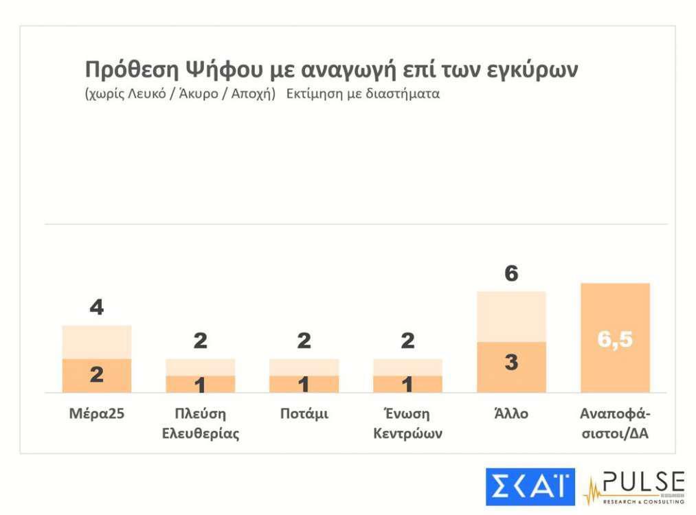 Η Μέρα25 του Γιάνη Βαρουφάκη λαμβάνει από 2% έως 4%, η Πλεύση Ελευθερίας από 1% έως 2%, το Ποτάμι από 1% έως 2%, η Ένωση Κεντρώων από 1% έως 2%. Η εκτίμηση για το Άλλο Κόμμα κυμαίνεται από 3% έως 6%. Μεγάλο είναι το ποσοστό των αναποφάσιστων και όσων δεν απάντησαν που έφτασε στο 6,5%.