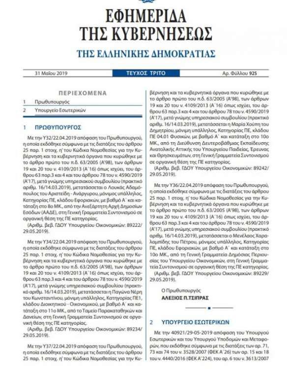 Συγκεκριμένα μετατέθηκαν τέσσερις υπάλληλοι στη Γενική Γραμματεία Συντονισμού, στις 31 Μαΐου, όπως προκύπτει από την Εφημερίδα της Κυβερνήσεως.
