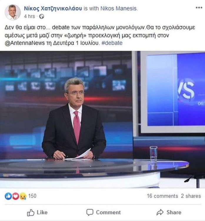 «Δεν θα είμαι στο… debate των παράλληλων μονολόγων. Θα το σχολιάσουμε αμέσως μετά μαζί στην «ζωηρή» προεκλογική μας εκπομπή στον @AntennaNews τη Δευτέρα 1 Ιουλίου», έγραψε ο κεντρικός παρουσιαστής του δελτίου ειδήσεων του ΑΝΤ1.