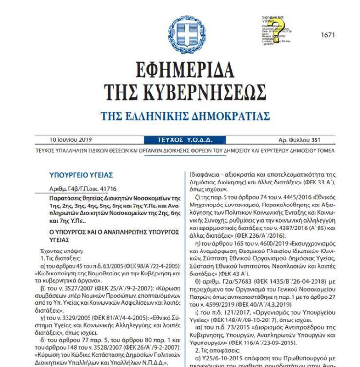 Το ΦΕΚ της υπουργικής απόφασης για παράταση της θητείας των διοικητών των Νοσοκομείων: