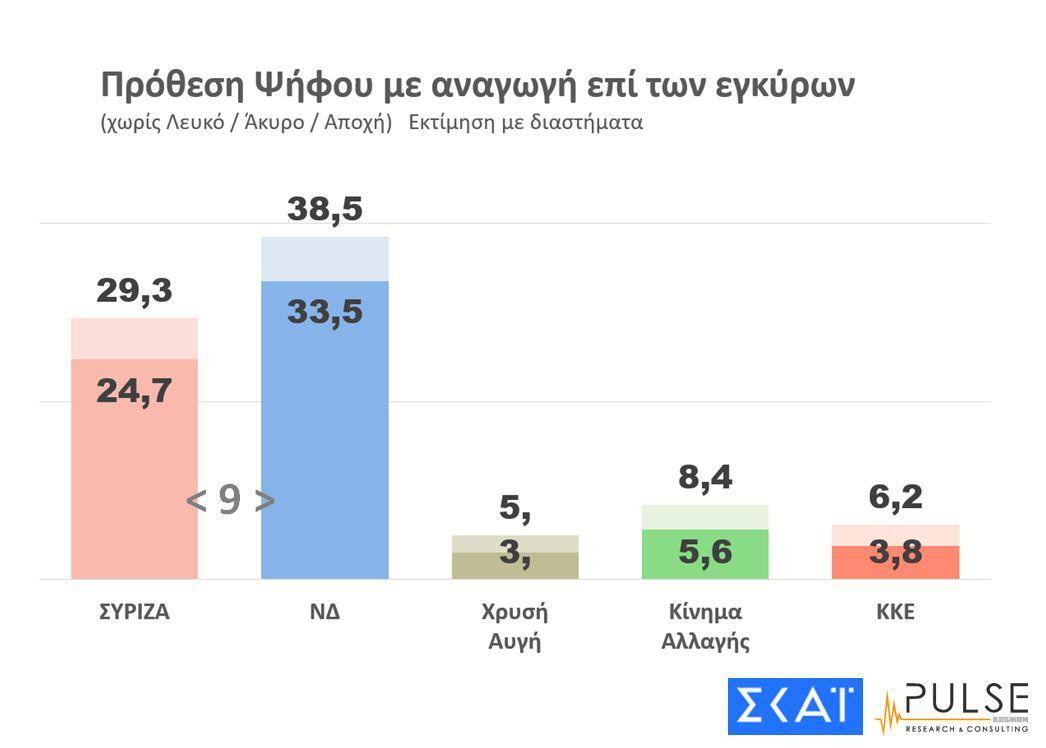 Αναλυτικότερα, η εκτίμηση για την πρόθεση ψήφου με αναγωγή επί των εγκύρων για τα υψηλότερα και τα χαμηλότερα ποσοστά των κομμάτων, δείχνει ότι το ποσοστό της ΝΔ θα κυμανθεί από 33,5% έως 38,5%. Ακολουθεί ο ΣΥΡΙΖΑ με 24,7% έως 29,3%, το ΚΙΝΑΛ με 8,4%-5,6%, το ΚΚΕ με 6,2% – 3,8%, η Χρυσή Αυγή με 5%-3%. Το άλλο κόμμα (δηλαδή Δημιουργία Ξανά, ΛΑΕ, ΑΝΤΑΡΣΥΑ, Οικολόγοι, ΕΠΑΜ) κυμαίνεται από 2,9% έως 5,1%, το Μέρα25 από 2,5% έως 4,5%, η Ελληνική Λύση από 2,5% έως 4,5% και οι αναποφάσιστοι και όσοι δεν απαντούν στο 7,5%.