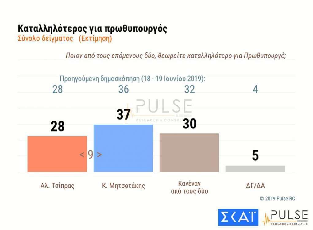 Στην καταλληλότητα για την πρωθυπουργία το 37% κρίνει ως πιο κατάλληλο τον πρόεδρο της ΝΔ, Κυριάκο Μητσοτάκη και το 30% κανέναν από τους δύο. Το 28% απαντά τον πρωθυπουργό, Αλέξη Τσίπρα και μόλις το 5% δηλώνει ότι δεν γνωρίζει/δεν απαντά.