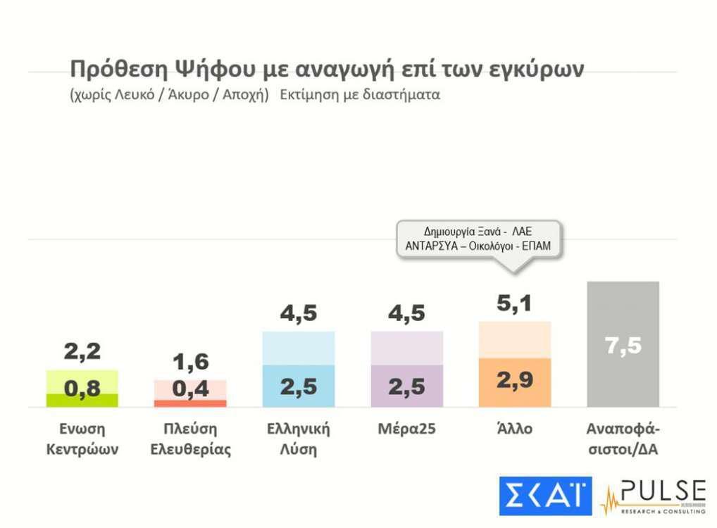 Η εκλογική εκτίμηση των κομμάτων εάν κατανεμηθούν οι αναποφάσιστοι και όσοι δεν απαντούν δίνει ποσοστό από 36,4% έως 41,6% στην ΝΔ και από 26,6% έως 31,4% στον ΣΥΡΙΖΑ. Από 6,2% έως 9% λαμβάνει το ΚΙΝΑΛ και από 4,2% έως 6,6% συγκεντρώνει το ΚΚΕ. Η Χρυσή Αυγή λαμβάνει από 3,3% έως 5,3%. Από 2,7% έως 4,9% λαμβάνουν Ελληνική Λύση και Μέρα25 αντίστοιχα. Η Ένωση Κεντρώων κυμαίνεται από 0,9% έως 2,3% και η Πλεύση Ελευθερίας από 0,5% έως 1,7%. Το άλλο κόμμα κυμαίνεται από 3,3% έως 5,5%.