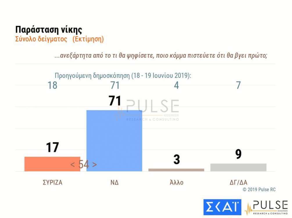 Στην παράσταση νίκης η ΝΔ βρίσκεται μπροστά με 71% και ακολουθεί ο ΣΥΡΙΖΑ με 17%.