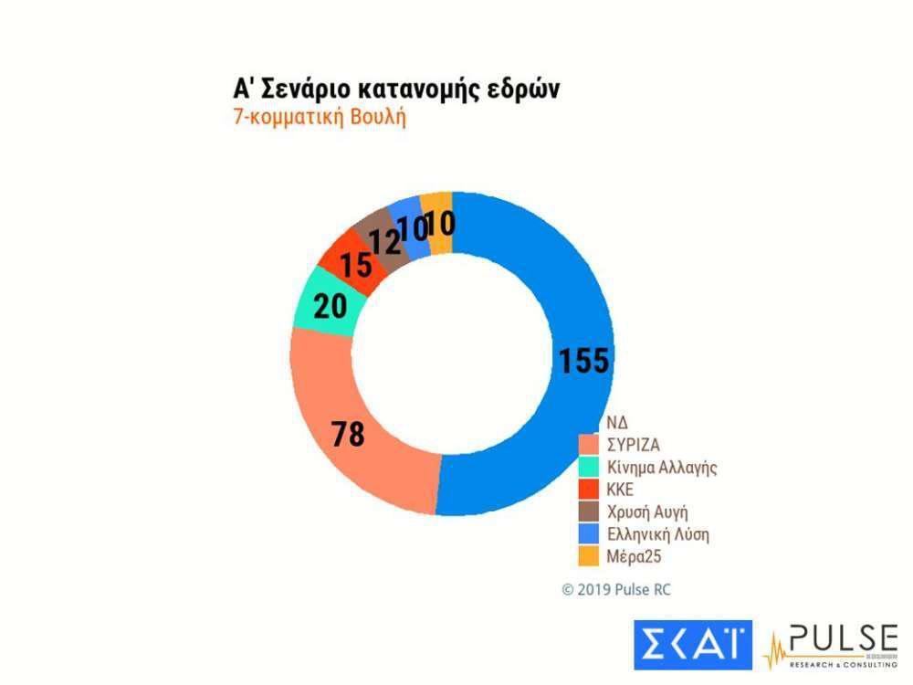 Το πρώτο σενάριο προβλέπει επτακομματική Βουλή και αυτοδυναμία της ΝΔ με 155 έδρες. Ακολουθεί ο ΣΥΡΙΖΑ με 78 έδρες, το ΚΙΝΑΛ με 20 έδρες, το ΚΚΕ με 15 έδρες, η Χρυσή Αυγή με 12 έδρες. Από 10 έδρες αντίστοιχα λαμβάνουν η Ελληνική Λύση και το Μέρα25.