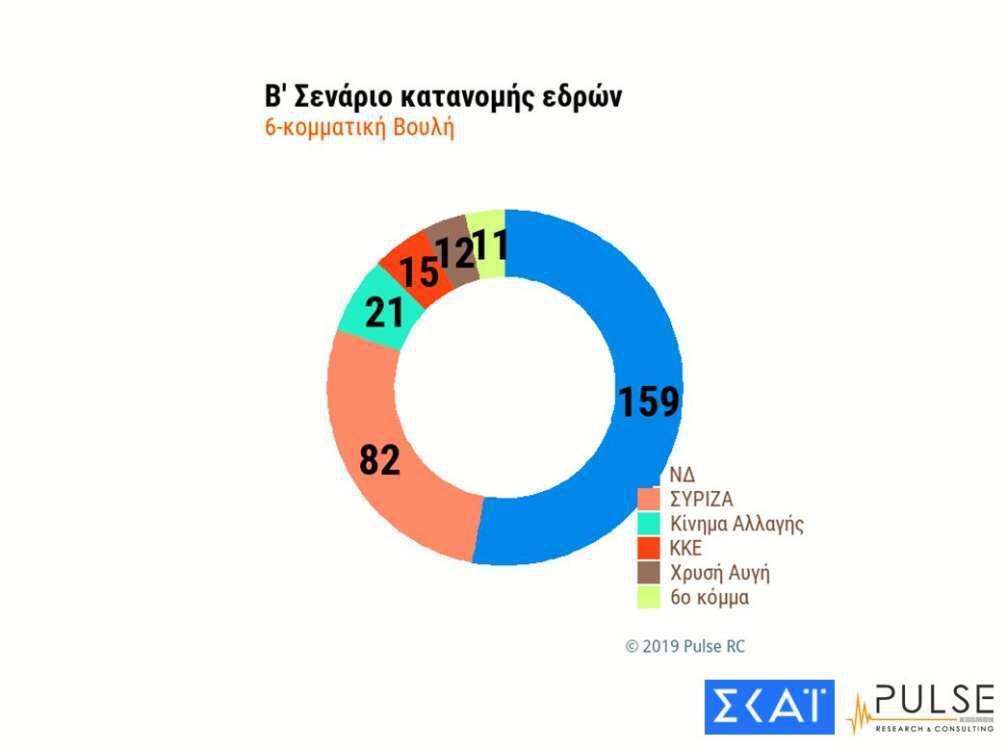 Το δεύτερο σενάριο προβλέπει εξακομματική Βουλή, δηλαδή ότι θα περάσει το όριο του 3% της εισόδου στην Βουλή είτε μόνο η Ελληνική Λύση είτε μόνο το Μέρα25. Σε αυτή την περίπτωση η ΝΔ λαμβάνει 159 έδρες, ο ΣΥΡΙΖΑ 82 έδρες, το ΚΙΝΑΛ 21 έδρες. Ακολουθεί το ΚΚΕ με 15 έδρες, η Χρυσή Αυγή με 12 έδρες. Το έκτο κόμμα θα λάβει 11 έδρες.