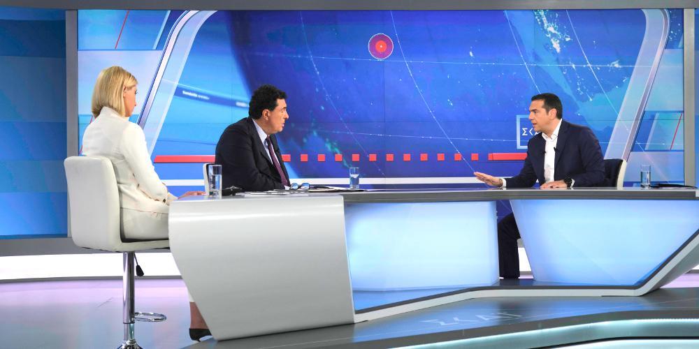 Απέναντί του η παρουσιάστρια του κεντρικού δελτίου ειδήσεων του ΣΚΑΪ Σία Κοσσιώνη και ο διευθυντής της «Καθημερινής» Αλέξης Παπαχελάς. Η πρώτη ερώτηση δεν θα μπορούσε να είναι άλλη από την άρση του εμπάργκο στον εν λόγω τηλεοπτικό σταθμό.