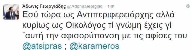 To εν λόγω σχόλιο προκάλεσε την αντίδραση του κ. Γεωργιάδη, ο οποίος έγραψε τα εξής: «Α δηλαδή αν έχεις πολιτικό συμφέρον τότε μπορείς να μολύνεις το περιβάλλον και να παραβιάζεις το νόμο; Ωραίος Οικολόγος».