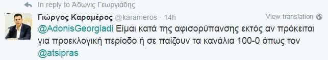 Ο Γιώργος Καραμέρος έγραψε: «Είμαι κατά της αφισορύπανσης εκτός αν πρόκειται για προεκλογική περίοδο ή σε παίζουν τα κανάλια 100-0».