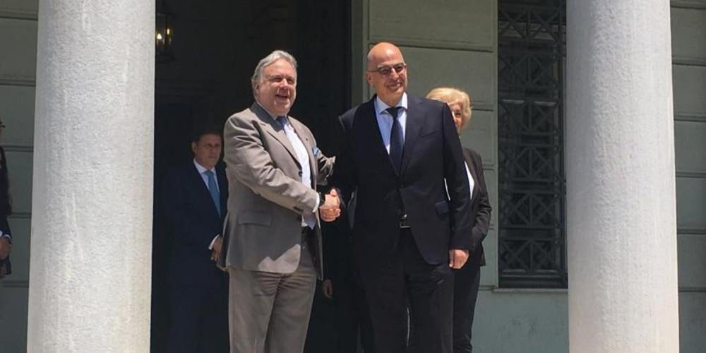 Τώρα: Τελετή παράδοσης-παραλαβής Υπουργείου Εξωτερικών – Υποδοχή νέου ΥΠΕΞ @NikosDendias από τον απερχόμενο ΥΠΕΞ Γ. Κατρούγκαλο @gkatr / Happening now at @GreeceMFA: New FM Nikos Dendias welcomed by outgoing FM G. Katrougalos pic.twitter.com/38QF7o6lxK