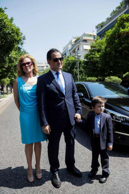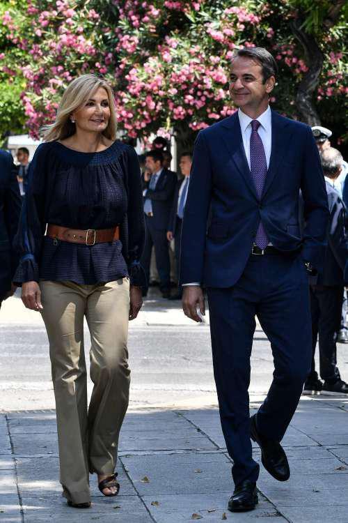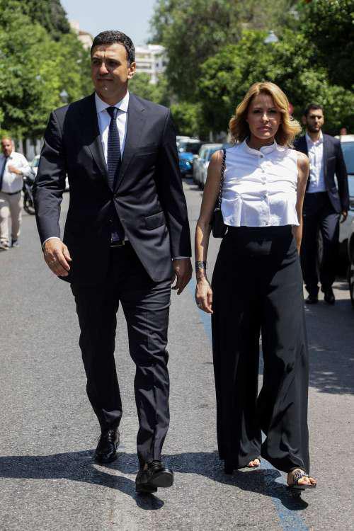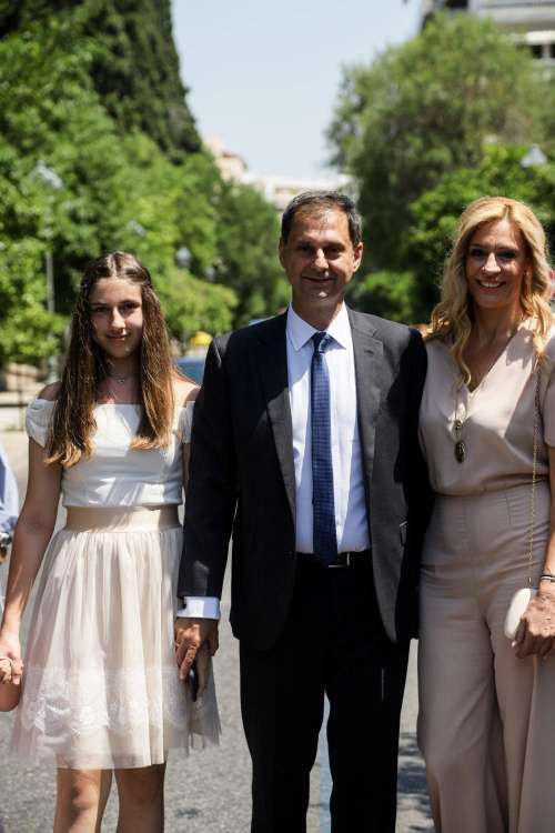 Γαλάζιο φόρεμα επέλεξε η Ευγενία Μανωλίδου, σύζυγος του Αδωνι Γεωργιάδη, η οποία περιτριγυρίστηκε από κάμερες αλλά θέλησε μόνο να ευχηθεί καλή επιτυχία στη νέα κυβέρνηση.
