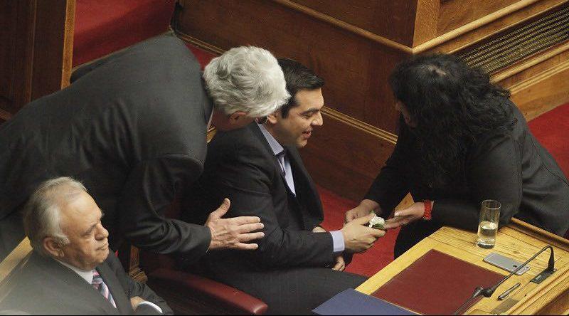 Η κυρία Βαγενά ανέβηκε τα σκαλάκια, κοντοστάθηκε δίπλα στον Αλέξη Τσίπρα και… αιφνιδιάζοντάς τον έβγαλε και του προσέφερε μια γαρδένια. Η κίνηση της βουλευτού φαίνεται ότι ξάφνιασε και τον ίδιο τον πρωθυπουργό, ο οποίος αντέδρασε με αμηχανία, γελώντας αρχικά και εν συνεχεία προσπαθώντας να κρύψει το λουλούδι κάτω από το έδρανό του…