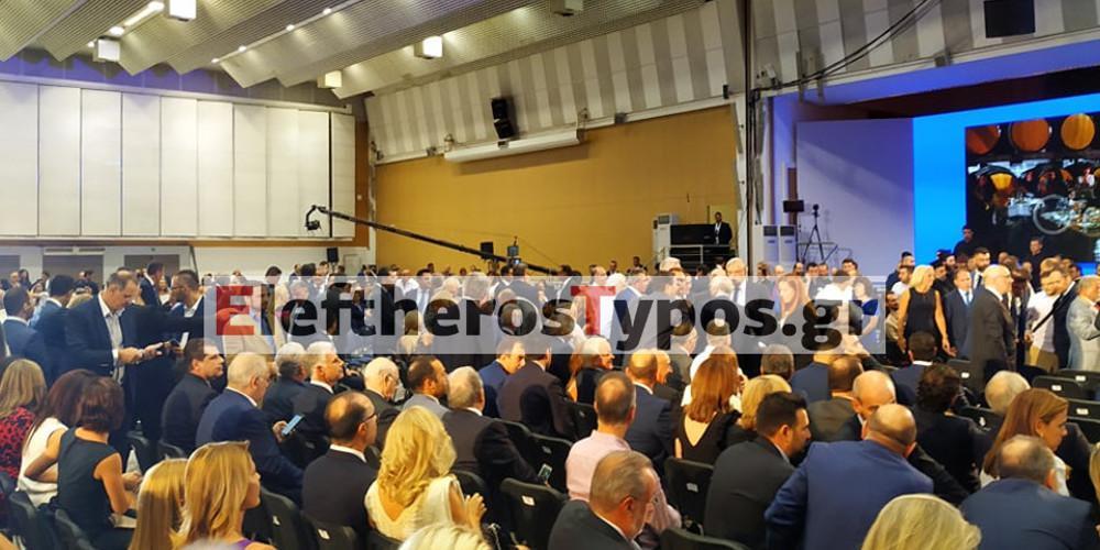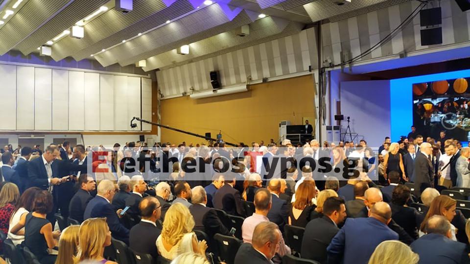 Ευδιάθετος και χαμογελαστός, φορώντας κόκκινη γραβάτα, ο Βαγγέλης Μαρινάκης έφτασε νωρίς στο Βελλίδειο Συνεδριακό Κέντρο και αφού χαιρέτισε κάποιους από τους παρευρισκόμενους, μπήκε στην αίθουσα.