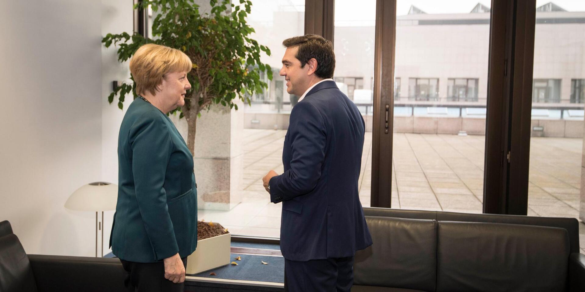Σε αντίστοιχο κλίμα διεξήχθη και η συνάντηση με την Άνγκελα Μέρκελ η οποία εξέφρασε την ανάγκη τήρησης των συμφωνιών από όλες τις πλευρές έτσι ώστε να υπάρξει έξοδος της Ελλάδας στις αγορές. Παράλληλα αποφασίστηκε η αποστολή στην Ελλάδα Γερμανών τεχνοκρατών στα θέματα μετεγκατάστασης και ασύλου προκειμένου να ενισχυθούν οι διαδικασίες παροχής ασύλου στη χώρα.