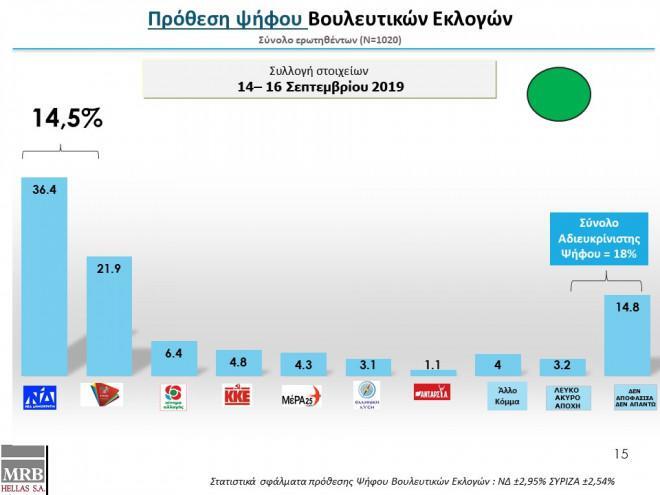 Στην πρόθεση ψήφου, η Νέα Δημοκρατία λαμβάνει 36,4% και ο ΣΥΡΙΖΑ 21,9% (διαφορά 14,5 μονάδων). Ακολουθεί το ΚΙΝΑΛ με ποσοστό 6,4%, το ΚΚΕ με 4,8%, το ΜέΡΑ25 με 4,3% και η Ελληνική Λύση με 3,1%.