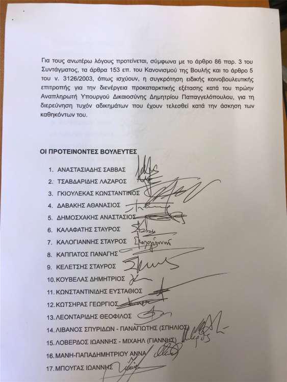 Η πρόταση υπογράφεται από 30 βουλευτές της ΝΔ για τη σύσταση ειδικής κοινοβουλευτικής επιτροπής προς διενέργεια προκαταρκτικής εξέτασης κατά του πρώην αναπληρωτή υπουργού Δικαιοσύνης Δημήτρη Παπαγγελόπουλου και την ανακοίνωση έκανε από το βήμα της Βουλής ο Πρόεδρος Κώστας Τασούλας.