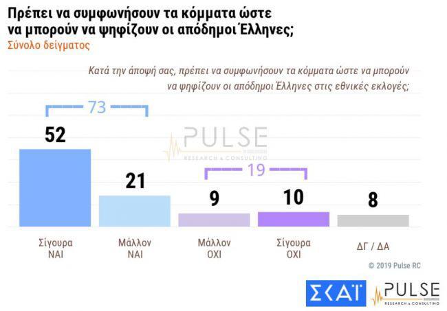 Υπέρ μιας συμφωνίας των κομμάτων ώστε να μπορούν να ψηφίζουν οι απόδημοι Έλληνες στις εθνικές εκλογές είναι οι πολίτες ενώ μεγάλο είναι και το προβάδισμα της ΝΔ επί του ΣΥΡΙΖΑ στην πρόθεση ψήφου, που ανέρχεται στο 13,5%.