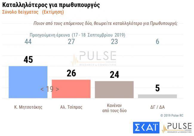 Σε ερώτηση σχετικά με το ποιος είναι καταλληλότερος για πρωθυπουργός, ο Κυριάκος Μητσοτάκης προηγείται του Αλέξη Τσίπρα με ποσοστό που φτάνει το 45% ενώ ο αρχηγός του ΣΥΡΙΖΑ φτάνει το 26%, υποχωρώντας μια μονάδα από την προηγούμενη δημοσκόπηση.