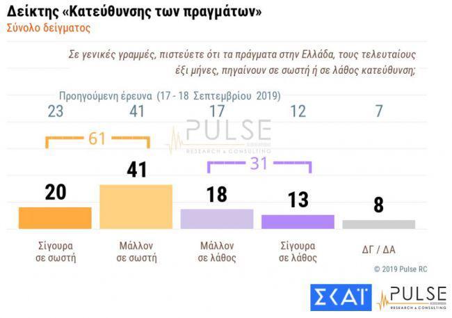 Στην ερώτηση αν πηγαίνουν προς τη σωστή ή τη λάθος κατεύθυνση τα πράγματα στη χώρα, οι ερωτηθέντες στην έρευνα της Pulse, που διενεργήθηκε το διάστημα 22 – 23 Οκτωβρίου 2019, απαντούν προς τη σωστή σε ποσοστό 61% (20% απαντά «σίγουρα σε σωστή» και 41% «μάλλον σε σωστή»).
