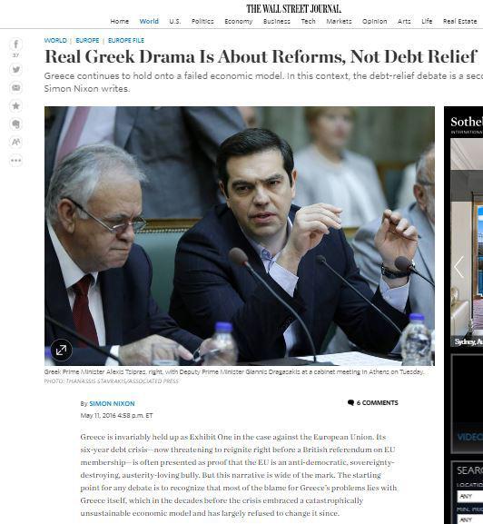 Και το άρθρο της WSJ καταλήγει: «Το πραγματικό δράμα δεν μπορεί να επιλυθεί παρά με δύο τρόπους: Είτε η Ελλάδα θα πρέπει επιτέλους να συμφωνήσει να εγκαταλείψει το αποτυχημένο οικονομικό μοντέλο της είτε η Γερμανία πρέπει να εγκαταλείψει την εμμονή της για τη συμμετοχή του ΔΝΤ στο πρόγραμμα διάσωσης, επιτρέποντας στην ευρωζώνη να δώσει στην Αθήνα αρκετά χρήματα… με άλλα λόγια, να αναβάλει οποιαδήποτε μακροπρόθεσμη επίλυση της κρίσης».