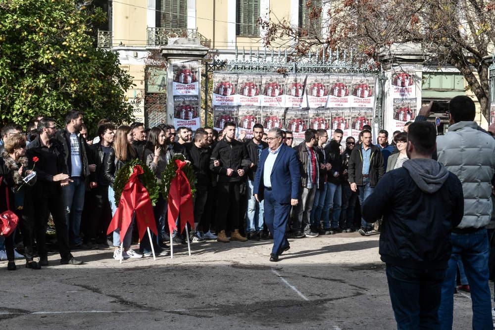 Την αντιπροσωπεία του ΚΚΕ υποδέχθηκαν στο Πολυτεχνείο μέλη και φίλοι του κόμματος, χειροκροτώντας και φωνάζοντας συνθήματα.