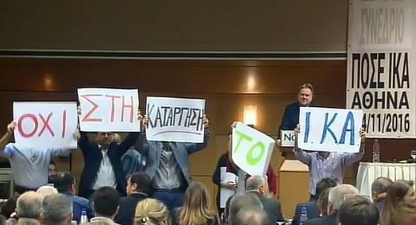 Την ώρα που ήταν σε εξέλιξη η ομιλία του κυρίου Κατρούγκλαου διαδηλωτές έκαναν την εμφάνισή τους και αφού τον διέκοψαν, στη συνέχεια τον γιούχαραν, ενώ σήκωσαν πλακάτ που έγραφαν «ΟΧΙ ΣΤΗΝ ΚΑΤΑΡΓΗΣΗ ΤΟΥ ΙΚΑ».