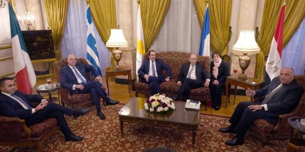 Στην πενταμερή συνάντηση, που πραγματοποιήθηκε στο Κάιρο, συμμετείχαν οι υπουργοί Εξωτερικών της Ελλάδας Νίκος Δένδιας, της Κύπρου Νίκος Χριστοδουλίδης, της Αιγύπτου Σάμεχ Σούκρι, της Γαλλίας Ζαν-Υβ Λε Ντριαν και της Ιταλίας Λουίτζι Ντι Μάιο.